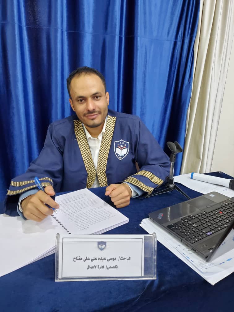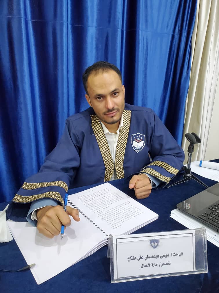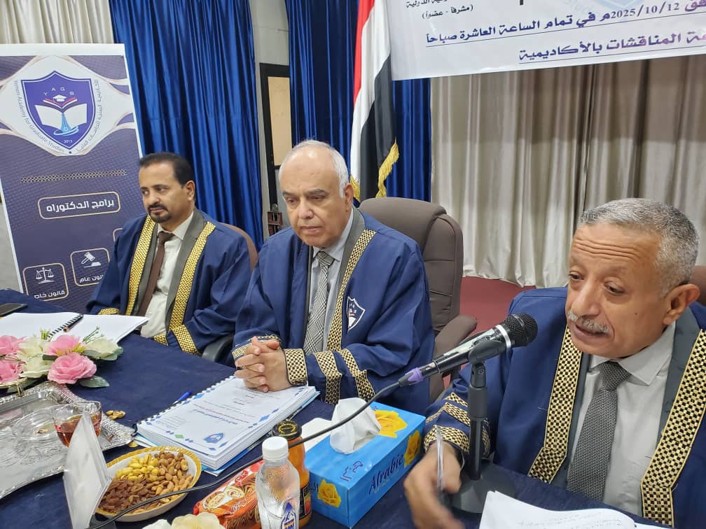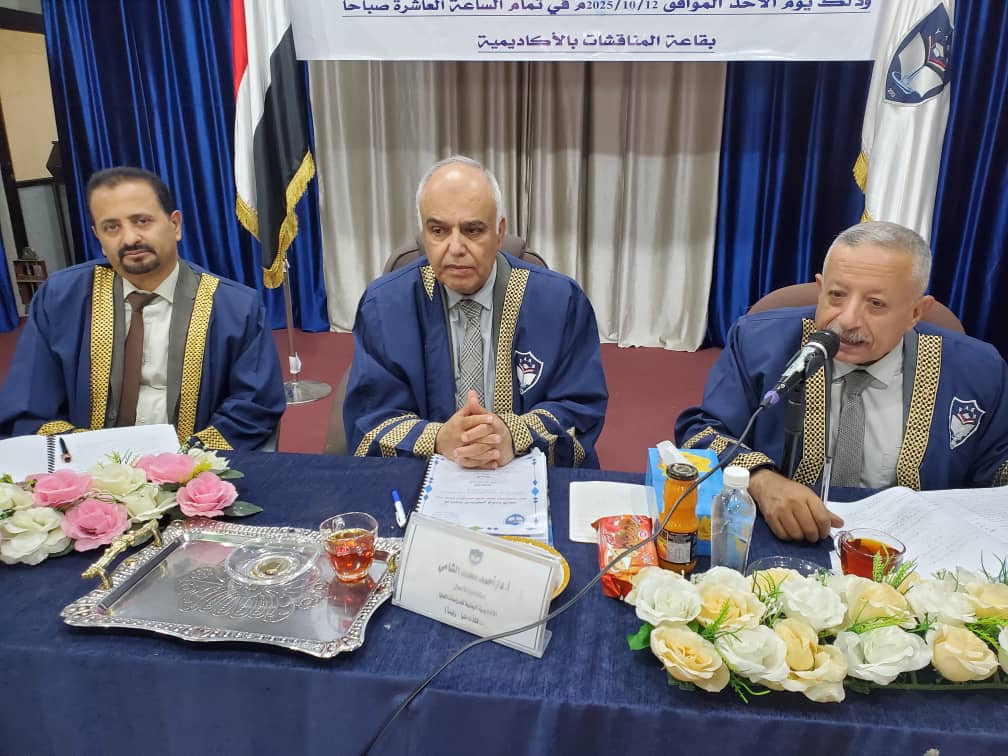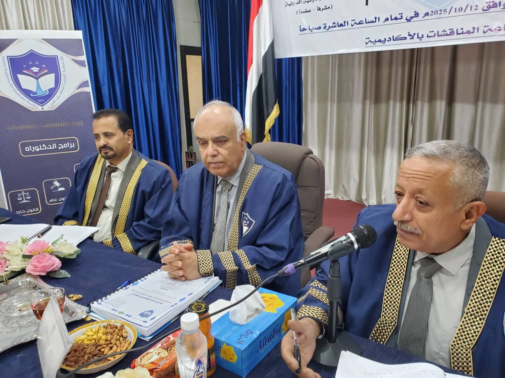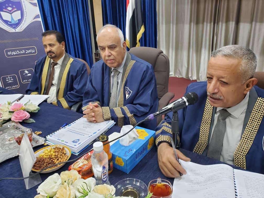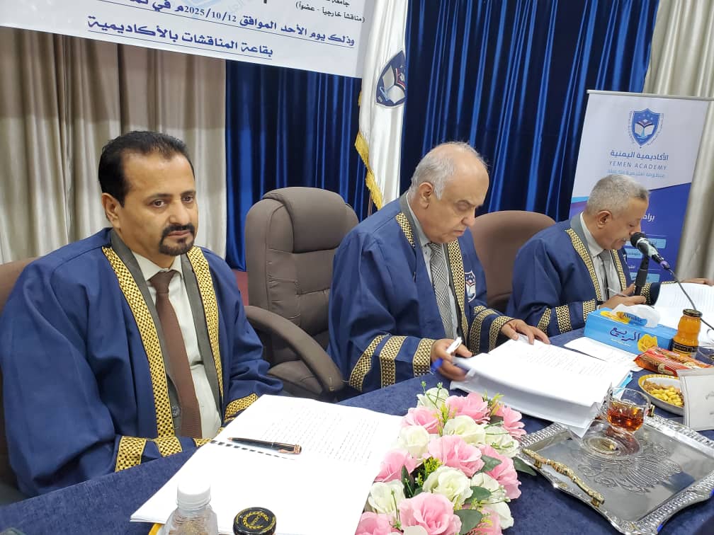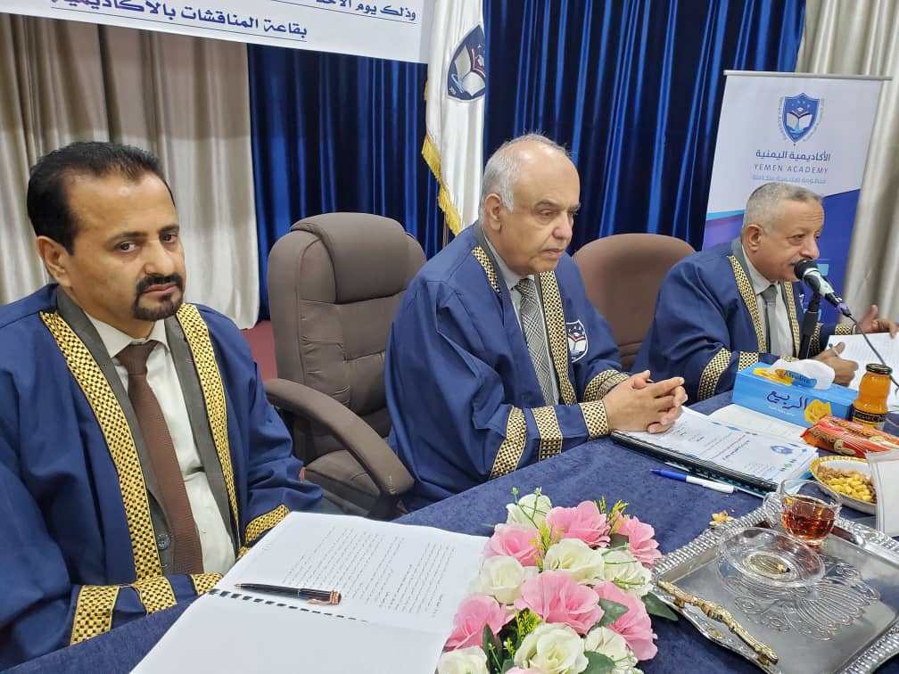 وتشكلت لجنة المناقشة والحكم من: استاذ إدارة الأعمال المساعد في جامعة صنعاء الدكتور عبدالكريم محمد الدعيس -مناقشاً ، واستاذ إدارة الأعمال في الأكاديمية اليمنية الأستاذ الدكتور أحمد محمد الشامي- مناقشاً ورئيساً، واستاذ إدارة الأعمال المشارك في الجامعة الإماراتية الدولية الدكتور جبر عبدالقوي السنباني – مشرفاً ، وبدأت جلسة المناقشة العاشرة صباحاً في قاعة المناقشات بمقر الأكاديمية اليمنية، حيث افتتح رئيس اللجنة الأستاذ الدكتور أحمد الشامي الجلسة بالترحيب بالحضور كلاً بأسمه وصفته، ومنح الباحث خمسة عشر دقيقة لاستعراض ملخص رسالته من حيث منهجية الدراسة وأهم النتائج والتوصيات.