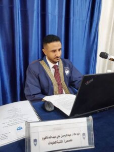 وتشكلت لجنة المناقشة والحكم من: استاذ هندسة البرمجيات في جامعة صنعاء الأستاذ الدكتور عبدالماجد أحمد الخليدي- مناقشاً ،وأستاذ علوم الحاسوب في الأكاديمية اليمنية الأستاذ الدكتور خليل سعيد الوجية -مناقشاً ورئيساً، وأستاذ هندسة البرمجيات في الأكاديمية اليمنية الأستاذ الدكتور منير عبدالله المخلافي – مشرفاً ، وبدأت جلسة المناقشة الثانية عشرة ظهراً في قاعة المناقشات بمقر الأكاديمية اليمنية، حيث افتتح رئيس اللجنة الأستاذ الدكتور خليل الوجية الجلسة بالترحيب بالحضور كلاً بأسمه وصفته، ومنح الباحث خمسة عشر دقيقة لاستعراض ملخص رسالته من حيث منهجية الدراسة وأهم النتائج والتوصيات.