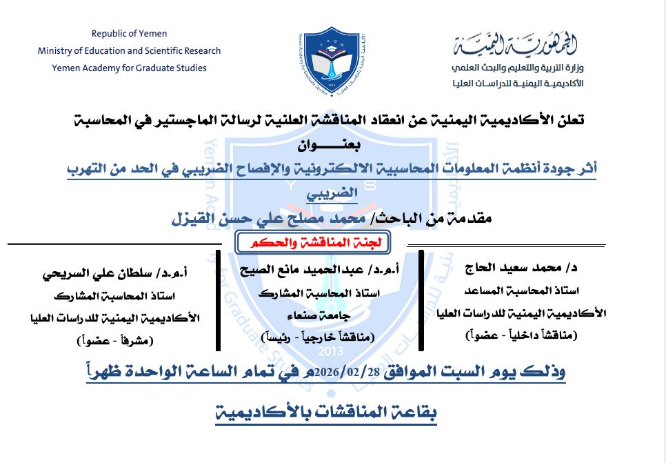 عقدت الأكاديمية اليمنية يوم السبت الموافق 08-02-2026م المناقشة العلنية لرسالة الماجستير في المحاسبة الموسومة ب “أثر جودة أنظمة المعلومات المحاسبية الالكترونية والإفصاح الضريبي في الحد من التهرب الضريبي للباحث/ محمد مصلح علي حسن القيزل.