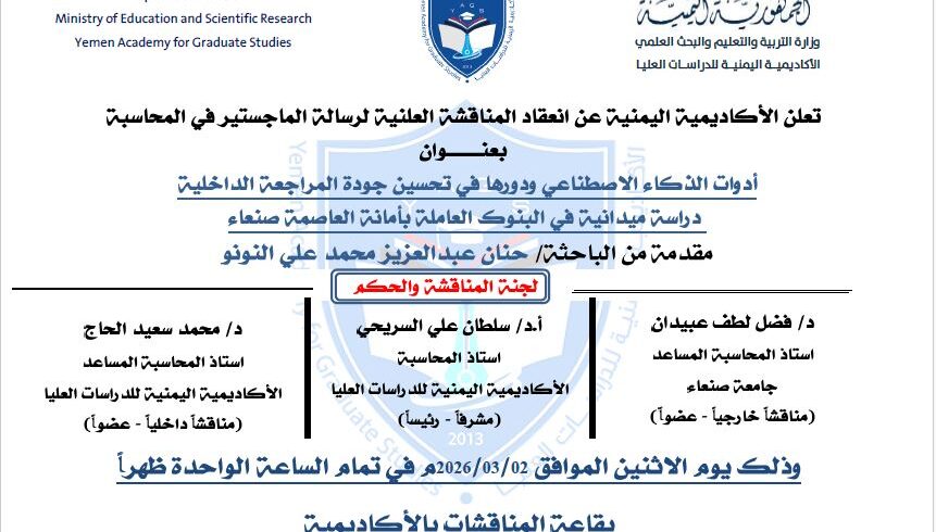 عقدت الأكاديمية اليمنية يوم الأثنين الموافق 02-03-2026م المناقشة العلنية لرسالة الماجستير في المحاسبة الموسومة ب “أدوات الذكاء الاصطناعي ودورها في تحسين جودة المراجعة الداخلية دراسة ميدانية في البنوك العاملة بأمانة العاصمة صنعاء للباحثة/ حنان عبدالعزيز محمد علي النونو. وتشكلت لجنة المناقشة والحكم من: استاذ المحاسبة المساعد في جامعة صنعاء الدكتور فضل لطف عبيدان- مناقشاً ،واستاذ...المزيد