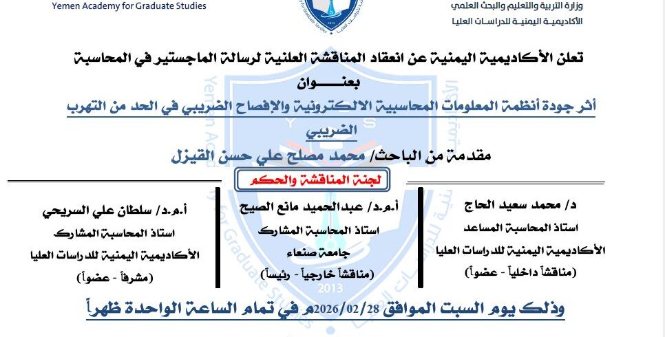 الأكاديمية اليمنية تناقش رسالة ماجستير في المحاسبة بعنوان”أثر جودة أنظمة المعلومات المحاسبية الالكترونية والإفصاح الضريبي في الحد من التهرب الضريبي “ عقدت الأكاديمية اليمنية يوم السبت الموافق 08-02-2026م المناقشة العلنية لرسالة الماجستير في المحاسبة الموسومة ب “أثر جودة أنظمة المعلومات المحاسبية الالكترونية والإفصاح الضريبي في الحد من التهرب الضريبي للباحث/ محمد مصلح علي حسن القيزل....المزيد