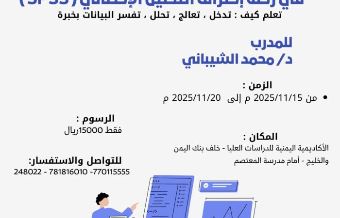 إعلان هام لكل الطلاب والباحثين ! هل تواجه صعوبة في تحليل بيانات بحثك ؟ 😰 هل تشعر ان الارقام معقده والنتائج غير واضحة ؟ *الان جاء وقت الحل 💪🏻 * انضم معنا في مركز الأكاديمية اليمنية للتدريب والاستشارات إلى دورة التحليل الاحصائي للطلاب والباحثين لنتعلم خطوه بخطوه كيف تحول بياناتك الى نتائج دقيقة وتقارير احترافيه […]